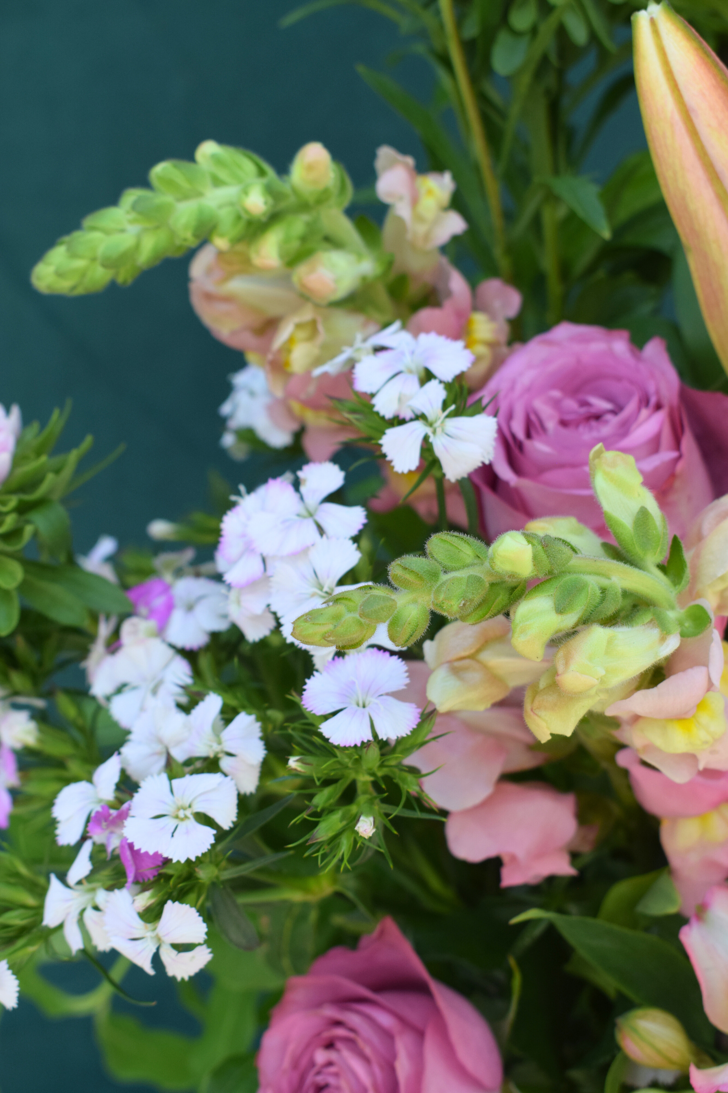 You can expect flowers such as pink roses, snapdragons, dianthus, ericas, gerberas, carnations, alstroemeria, or oriental lilies. The particular flowers chosen will vary based on seasonal availability.